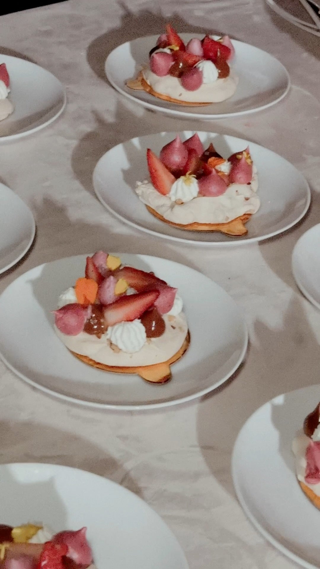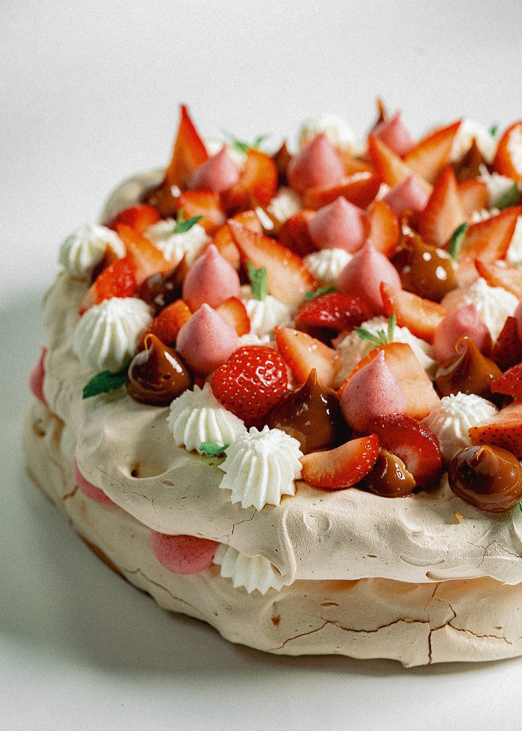 Experience the creation of a pavlova cake—layered meringue, fresh fruits, and whipped cream—crafted live for a show as sweet as the cake itself.