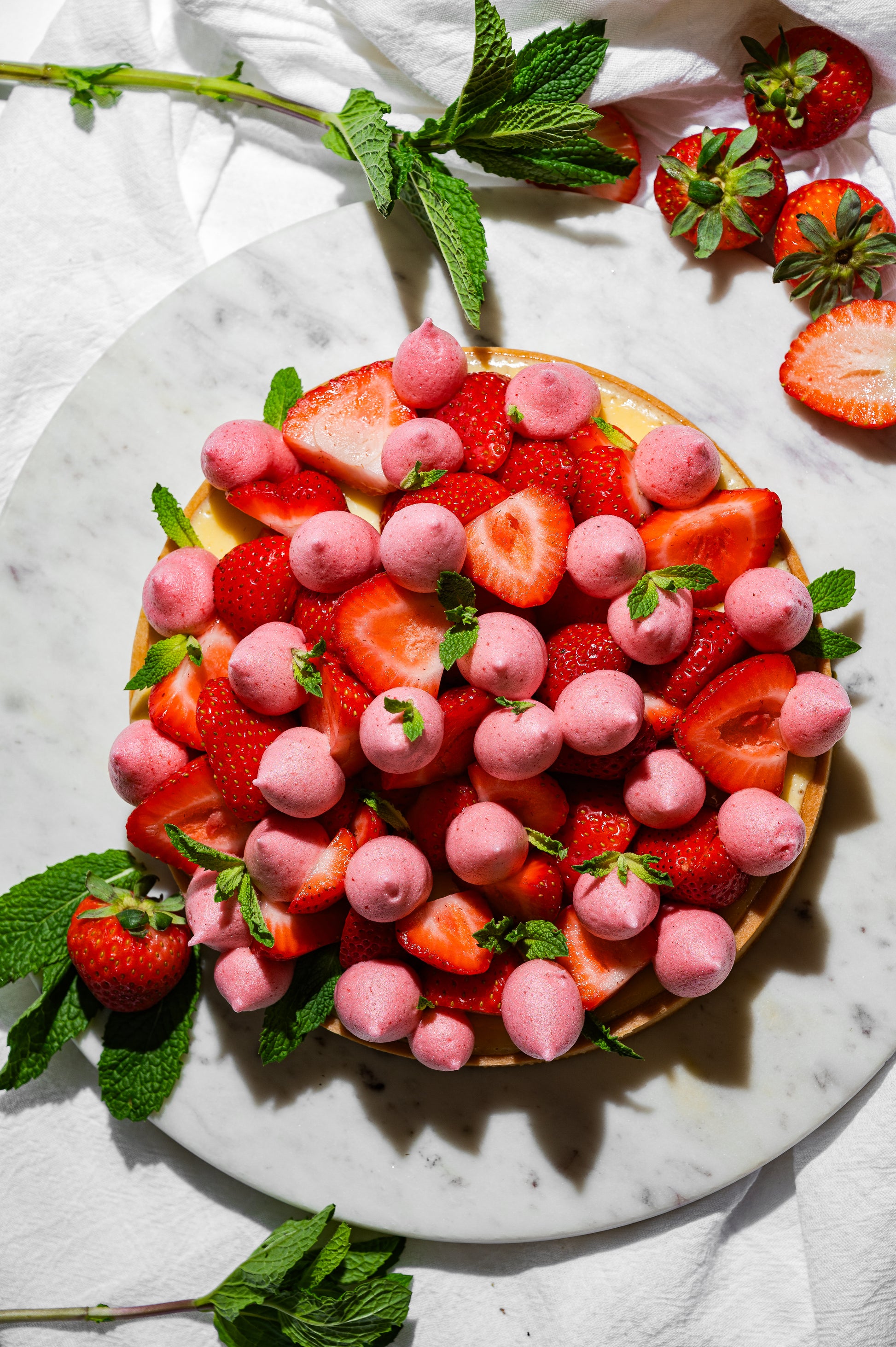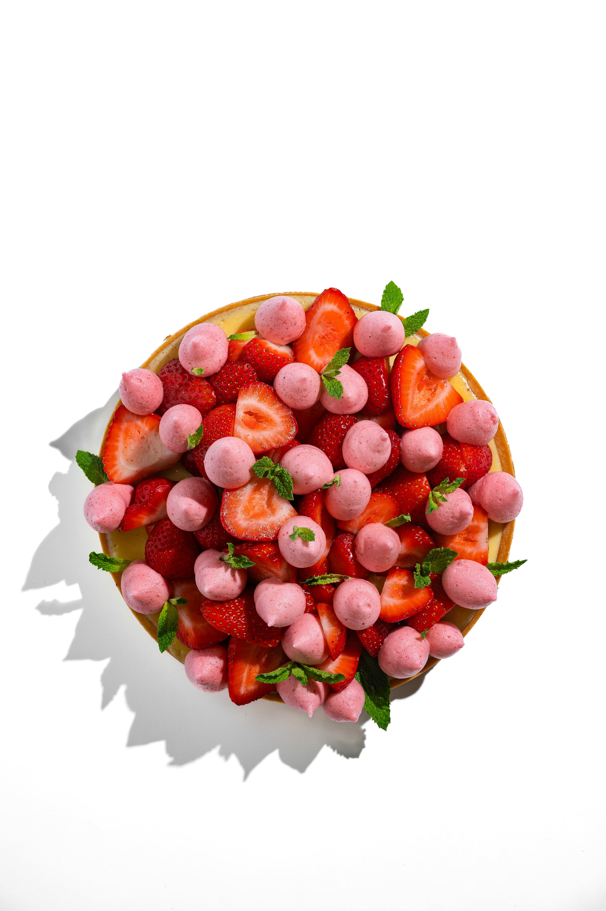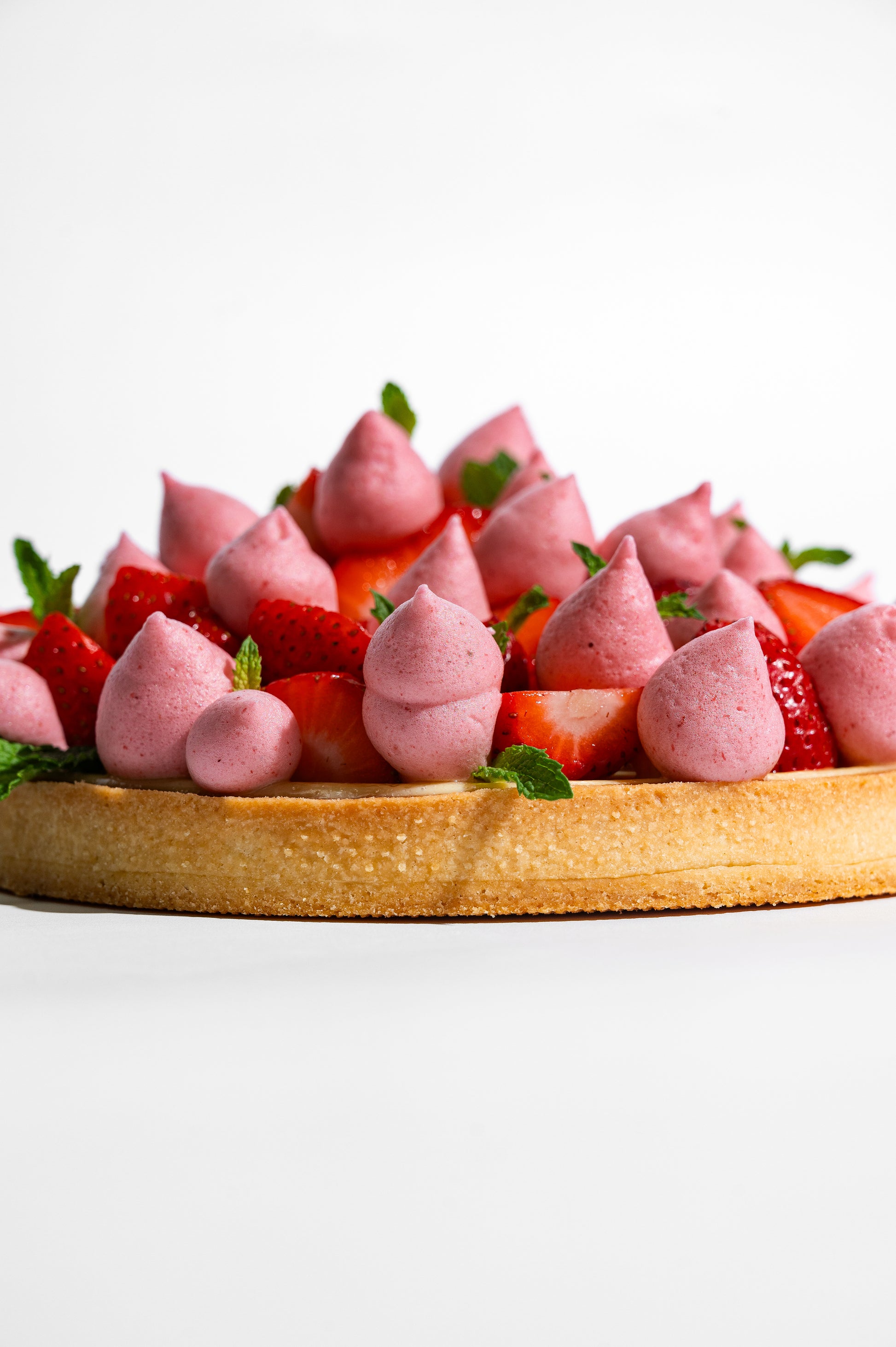Indulge in a vibrant key lime tart featuring a tangy, creamy filling, topped with fresh berries, delicate peaks of strawberry cream, and a refreshing mint leaf. Each bite balances citrusy brightness with a hint of sweetness, perfect for a refined dessert experience. Order yours for a taste of elegance in every slice! Size: 8"